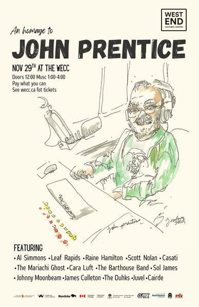 An homage to a pillar of our music community John Prentice. A man who dedicated himself to empowerment and inclusion of new voices in Manitoba.The musician community wants to dedicate songs in his honour and remember what we all learned form his kindness and dedication to community. Join us to raise a glass for John.